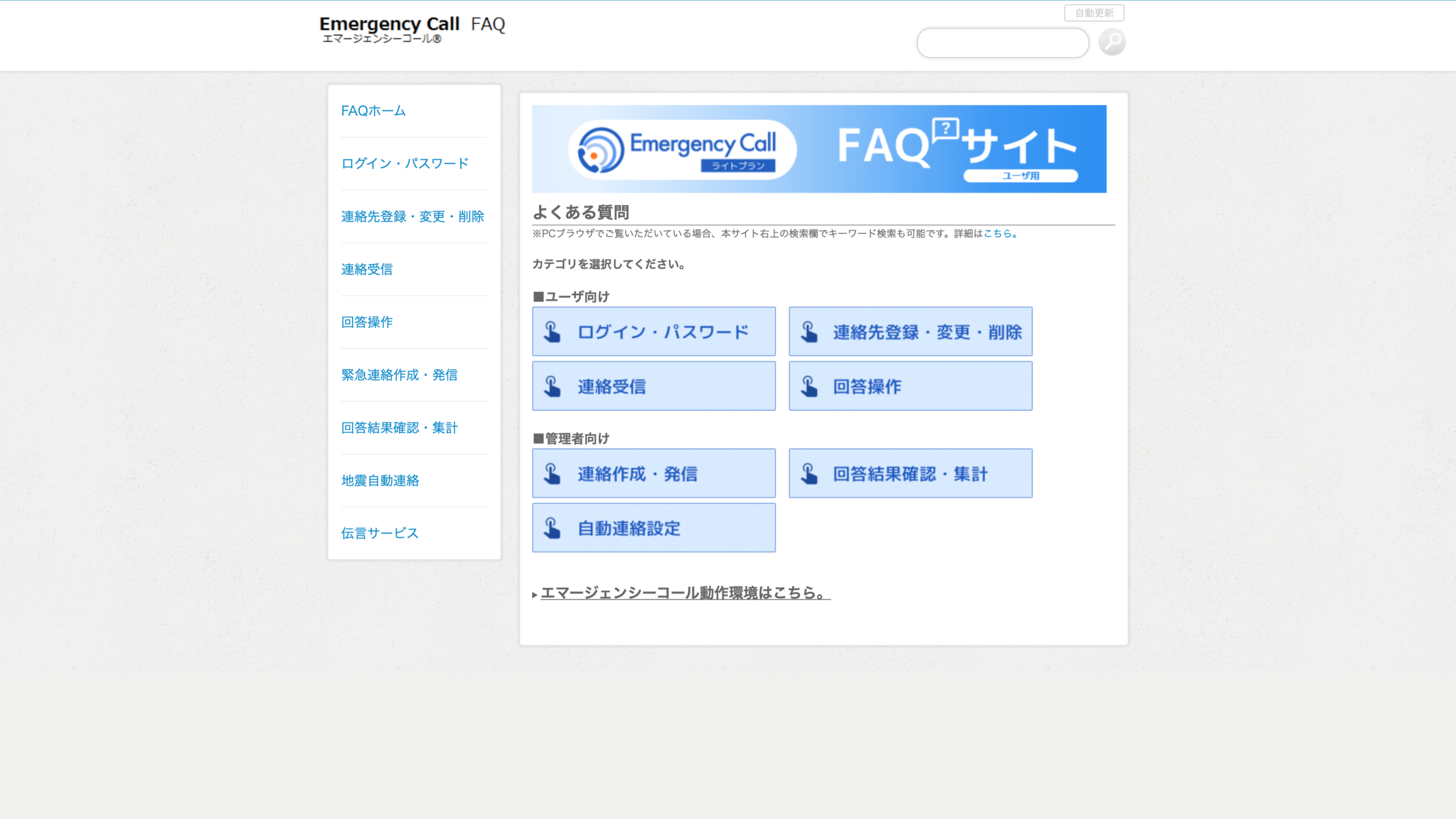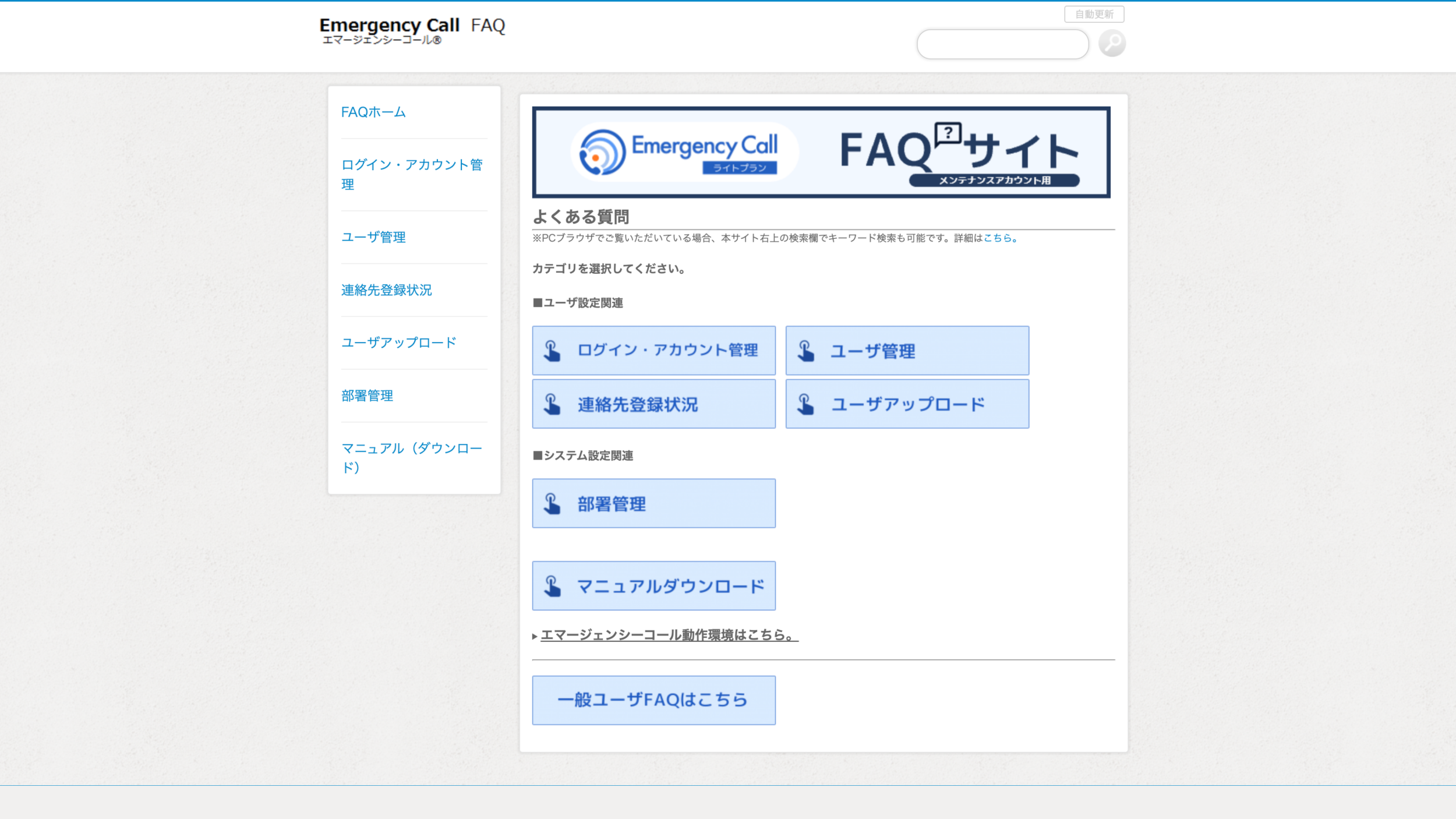 エマージェンシーコールライトプランのメンテナンスサイト(製品)のFAQが確認できるサイトです。